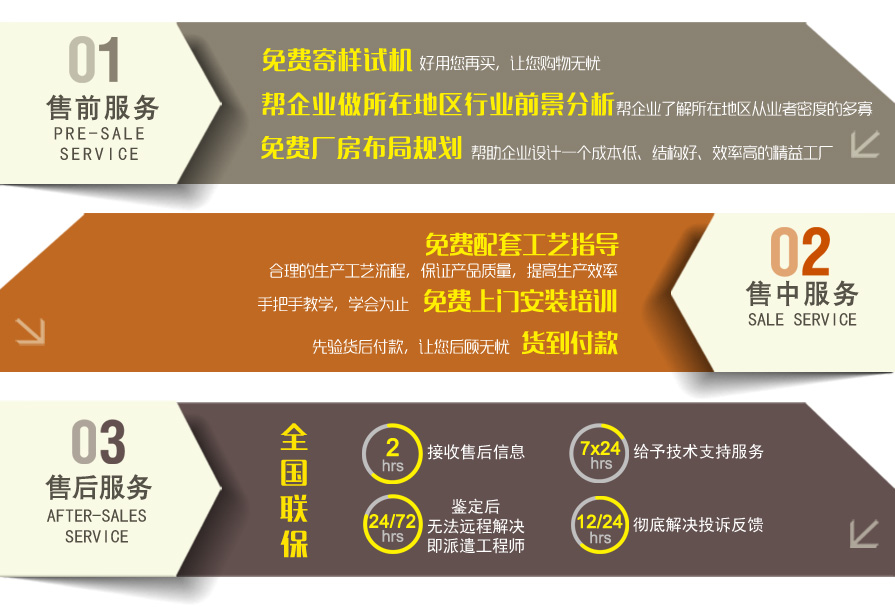 在售前/售中/售后階段提供:免費寄樣試機→免費廠房布局規(guī)劃→免費設(shè)備安裝培訓(xùn)→免費配套工藝指導(dǎo)→免費提供上下游渠道資源→免費售后服務(wù)維護,等一站式配套服務(wù)。查看更多》