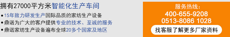 我司-江蘇鼎諾機電有限公司,家紡設(shè)備源頭制造商!憑借地處南通國際家紡城-行業(yè)產(chǎn)業(yè)帶的地理優(yōu)勢,潛心經(jīng)營十余載,專業(yè)服務(wù)中大型家紡生產(chǎn)企業(yè)1000+,積累了豐富的技術(shù)儲備【ISO9001/CE雙認證】。